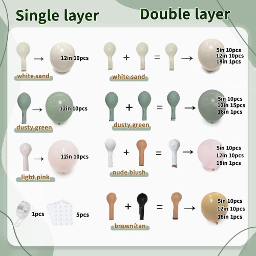 - Sage Green Balloon Arch Kit: The spring balloons double stuffed have 88 pieces included(dusty green balloons + tan balloons+ blush balloons + sand white balloons )、singe layer balloons have 31 pieces included (sage green balloons +sand white balloons+light pink balloons).balloon tape, balloon glue and white ribbon; Different sizes and colors help your sage green brown balloon garland arch kit look fuller.The pastel balloon arch are pre-grouped and packed in proportion to ensure a natural transition of the arches and a high-end Morandi color effect without the need to adjust the color